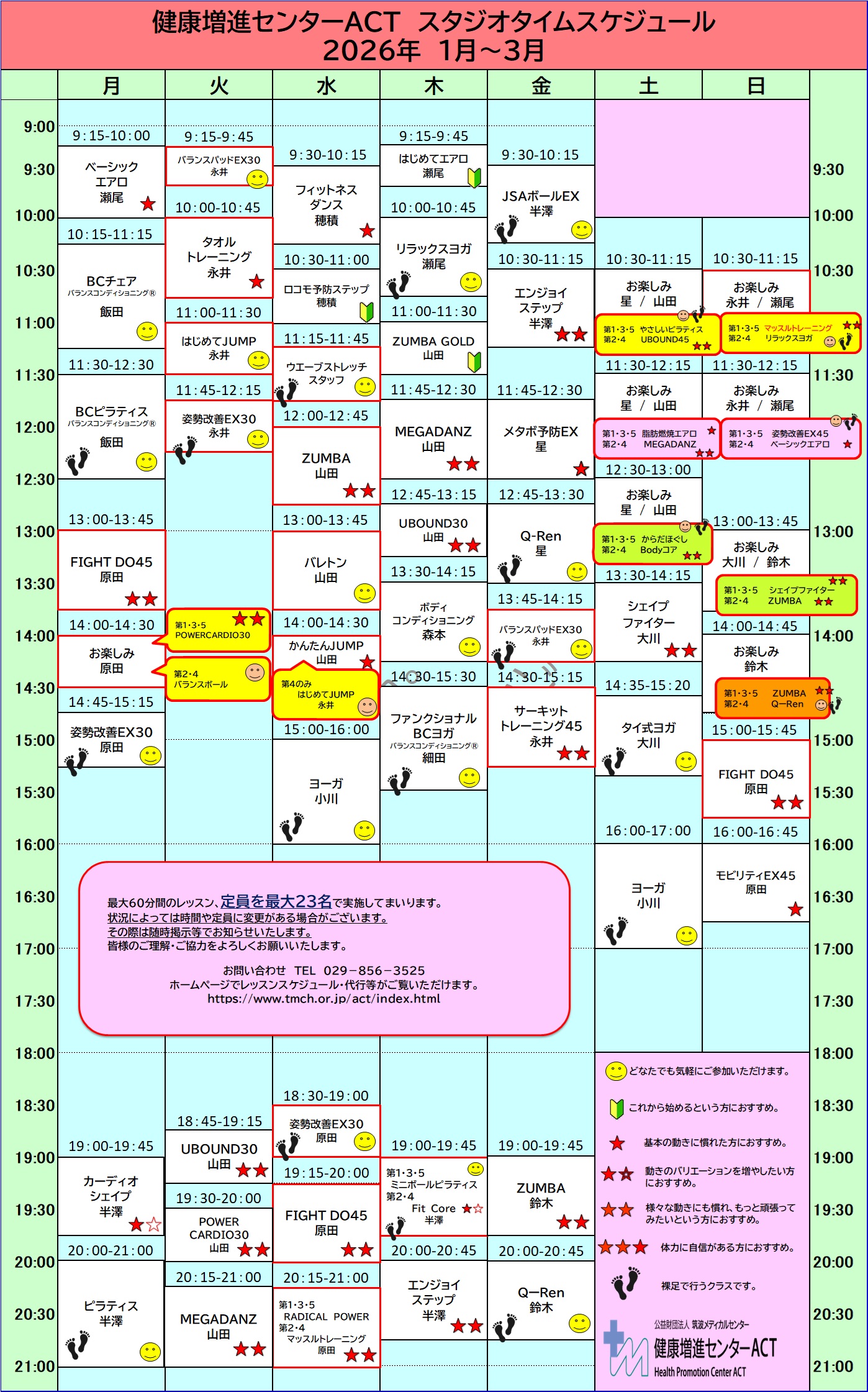 - 都合により、担当インストラクター・クラス内容が変更になる場合があります。その際は、