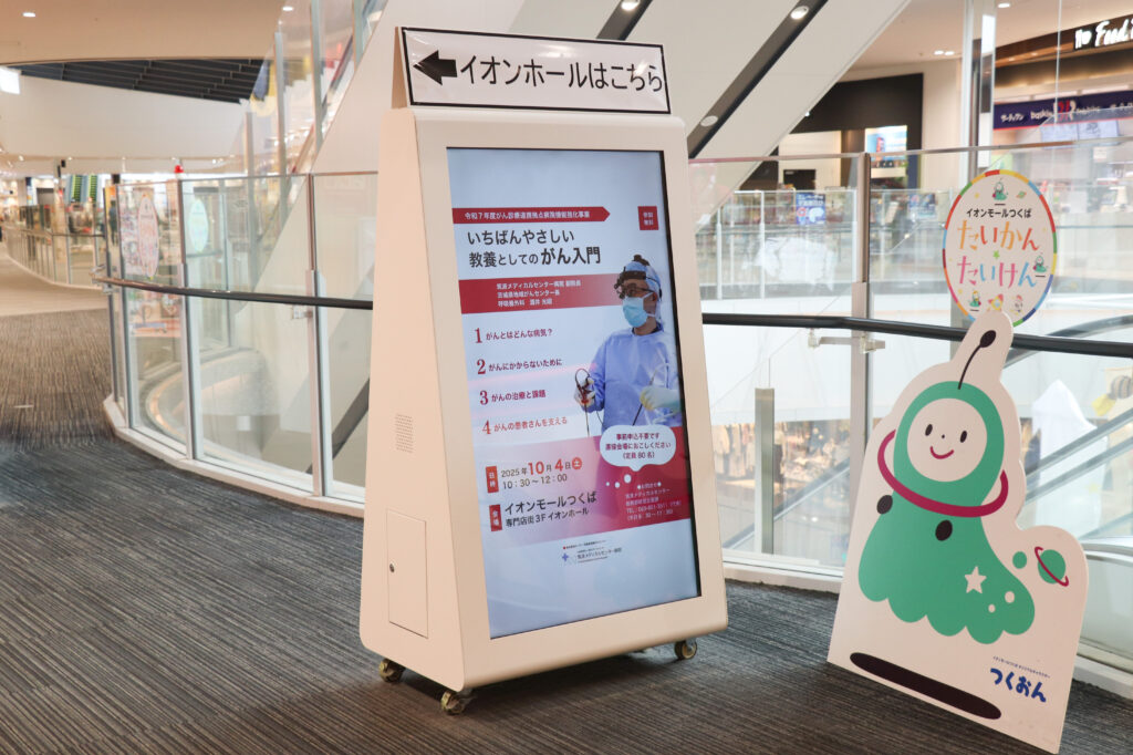 2025年10月4日(土)、講演会「いちばんやさしい教養としてのがん入門」をイオンモールつくばにて開催いたしました。本講演会は、「がん」についての基本的な知識をわかりやすく学べる場として企画し、「がんとはどういう病気か」「予防と早期発見のためにできること」などを、医学的な視点からも一般の視点からも、わかりやすく解説いたしました。
