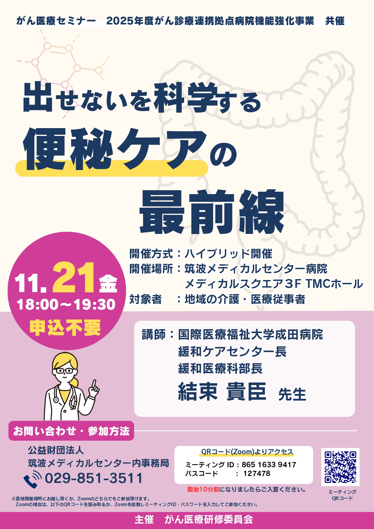 | ハイブリット開催 | 【現地開催】筑波メディカルセンター病院 メディカルスクエア3階 TMCホール 【ZOOM配信】 https://us02web.zoom.us/j/86516339417?pwd=qN7HQa7W6V4w1nvY60SbdyaNaj5lft.1 開始10分前になりましたら、上記URLよりアクセスしてください ミーティングID 865 1633 9417 パスコ―ド 127478 |