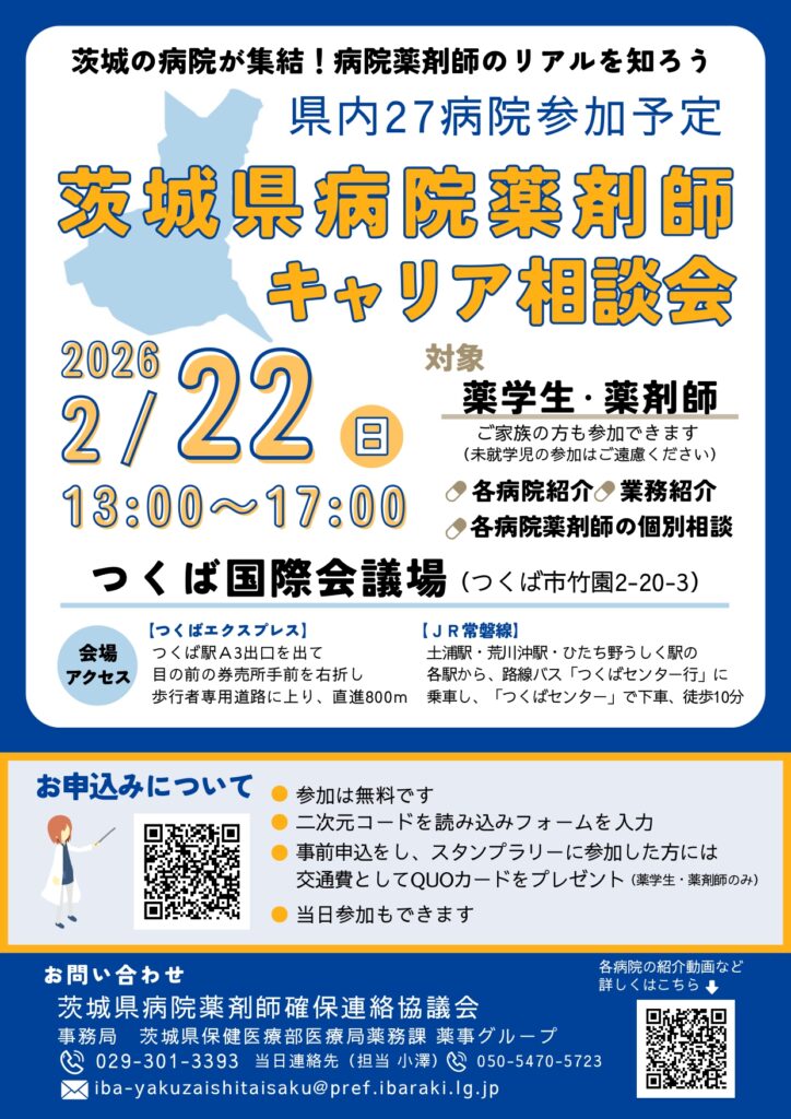当院も本相談会に出展し、病院薬剤師としての働き方や職場環境について、来場者の皆さまと直接お話しできる機会を設けています。病院ごとの特色に触れながら、病院薬剤師という進路について考えていただける内容となっていますので、病院薬剤師に興味をお持ちの方、茨城県内での就職やキャリアを検討されている方、ぜひ当院のブースへお立ち寄りください。