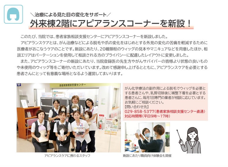 アピアランスケアとは、がん治療などによる脱毛や爪の変化をはじめとする外見の変化の苦痛を軽減するために医療者がおこなうケアのことです。必要とされる患者さんやご家族からのご相談にも応じていますので、ぜひご利用ください。